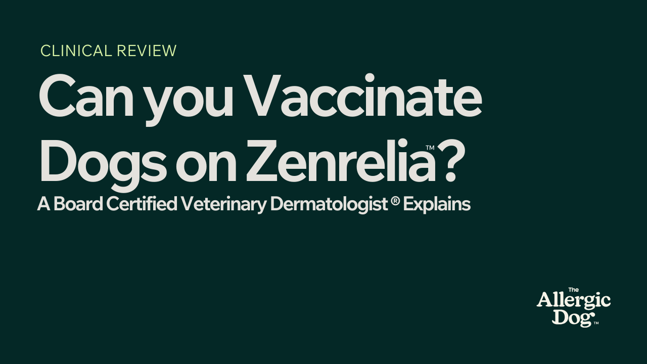 "A 2025 study found that previously vaccinated adult dogs on Zenrelia developed normal, protective immunity to core vaccines—the responses were indistinguishable from dogs not on the drug. The current product label still recommends stopping the medication before vaccination, so we need to talk about what makes sense for your dog specifically."